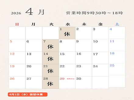4 052026 4月営業日ご案内 Post Share Hatena LINE Threads Pin it note この記事のタイトルとURLをコピーする いつもルーテシアをご利用いただきありがとうございます。 4月営業日ご案内です。 気温も段々と暖かくなりお花見やピクニックの時期になってきましたね🌸 是非おともに焼菓子やケーキはいかがでしょうか🍰 皆様のご来店をお待ちしております! Post Share Hatena LINE Threads Pin it note この記事のタイトルとURLをコピーする 3月営業日ご案内 前の記事
