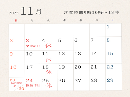 11 162025 11月営業日カレンダー Post Share Hatena LINE Pin it note この記事のタイトルとURLをコピーする Post Share Hatena LINE Pin it note この記事のタイトルとURLをコピーする クリスマスケーキの予約開始日が決まりました! 前の記事 新作ケーキお知らせ 次の記事